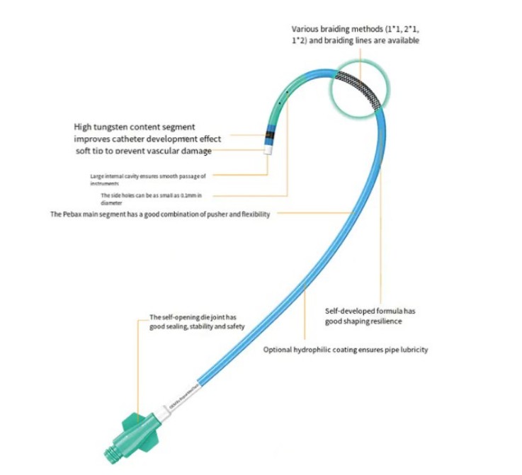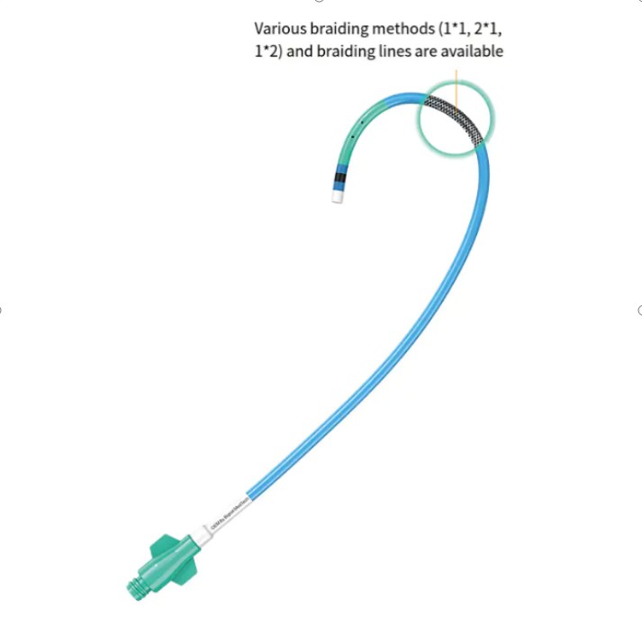 Beim Führungskatheter besteht die geflochtene Struktur üblicherweise aus Metalldraht, der eine gute Biokompatibilität und Festigkeit aufweist und die Stabilität und Sicherheit des Katheters bei der Operation im Körper gewährleisten kann. Darüber hinaus kann durch die Flechtstruktur auch durch unterschiedliche Flechtmuster ein Gleichgewicht zwischen Flexibilität und Schieben erreicht werden, so dass der Katheter bei Bedarf flexibel gebogen werden kann und ausreichend Halt bietet, wenn er geschoben werden muss.